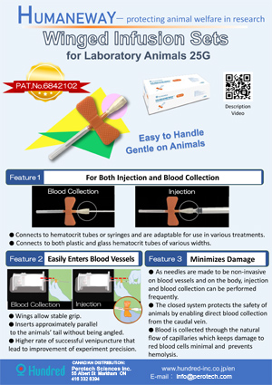 Winged laboratory needles are designed to protect both handlers and animals. This infusion set enhances research efficiency by ensuring a high level of safety during handling. It reduces animal stress, allows the needle to enter blood vessels smoothly, and prevents the destruction of red blood cells. These features are made possible through the use of multiple patented technologies.