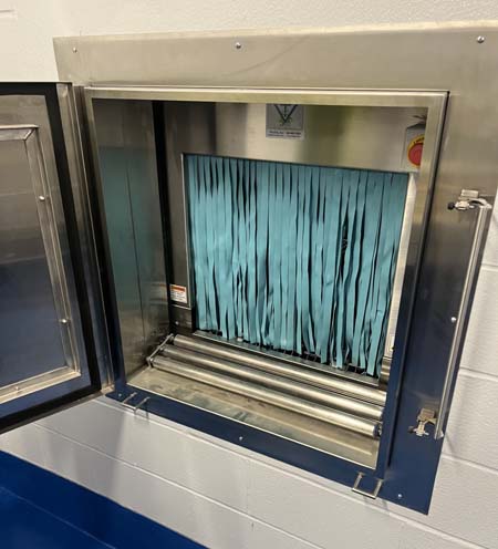 For enhanced containment, an optional pass-through door transforms the system into a dirty-to-clean barrier solution. In this setup, the misting tunnel remains entirely on the “dirty” side, while an off-load conveyor connects through the pass-through door on the “clean” side. When the tunnel is not in use, the door can be securely closed to maintain facility integrity.